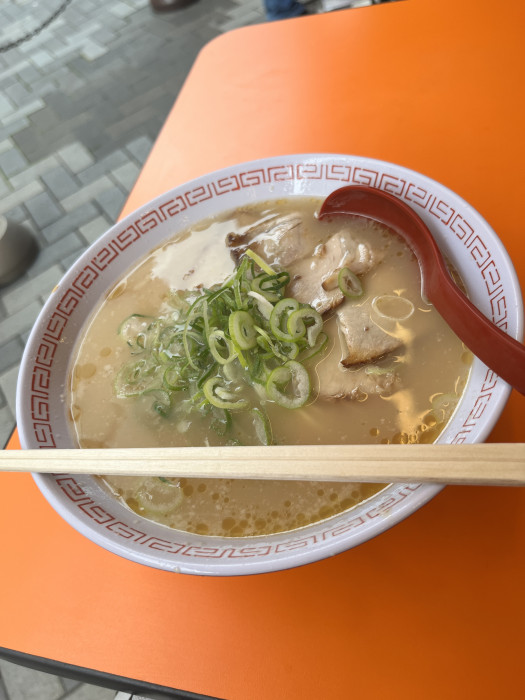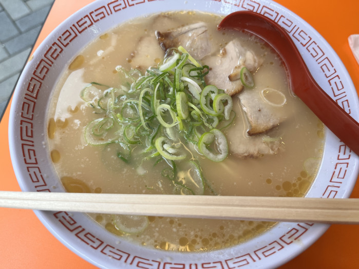 あっさりと、しかし旨味はがつんとくるスープにチャーシューとネギ、細麺のバランスがなんとも心地よく、外の空気と相まって解放感たっぷりのあじわい。