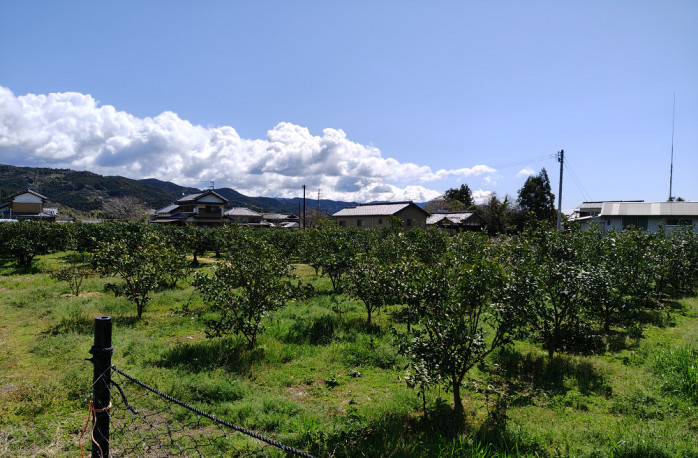 空は青く、葉の濃い緑がはっきりと見える。畑の周囲には家がまとまって建ち、山の中にぽつんと開かれた畑とは少し異なる景色が広がる。