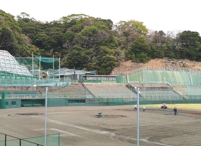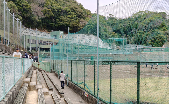 3月の昼過ぎ、晴れた空の下で訪れると、メイン球場では関西方面から来た高校野球部が練習を終え、グラウンド整備と後片付けが行われていた。