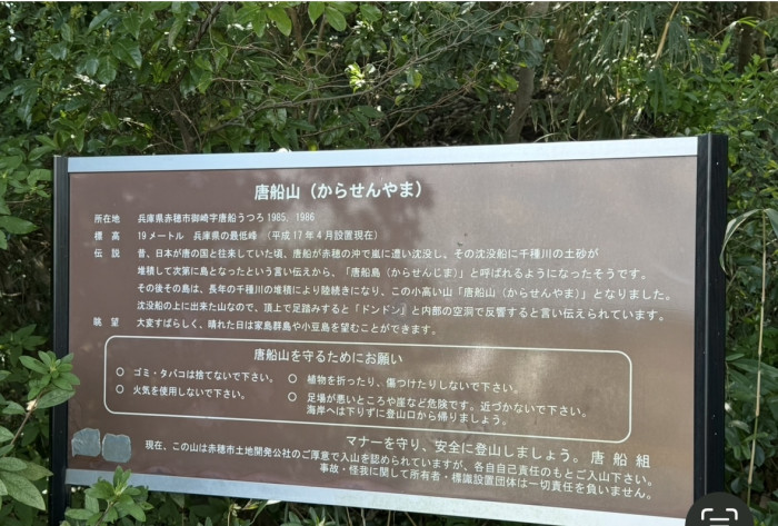 昔、宝物を積んだ唐の船が、赤穂の沖で嵐にあい、沈没し、千種川の土砂に埋まって山となり、唐船山と呼ばれるようになったのだとか。
