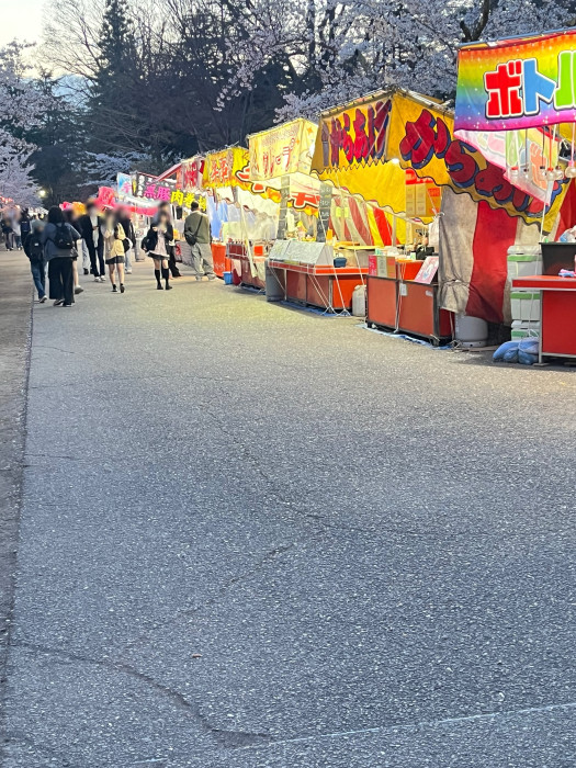 桜祭りでは、桜が見られるだけではなくたくさんの屋台が出ます。屋台の種類は豊富で定番のたこやきやからあげなどから、あまり見ることのない韓国のアイスクリームなどもありました。