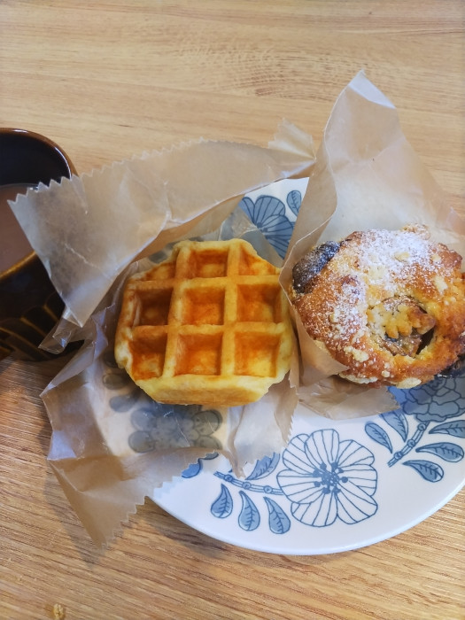 テイクアウトでマフィンとベルギーワッフルを購入して家で頂きました♪