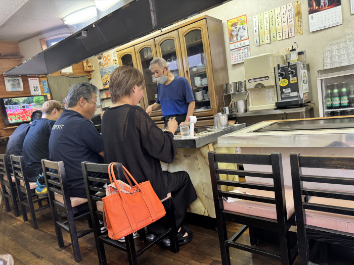 店内はこじんまりとしていて、23席(カウンター10席、テーブル13席)。人気店なので中でも外でも待っているお客さんがいます。