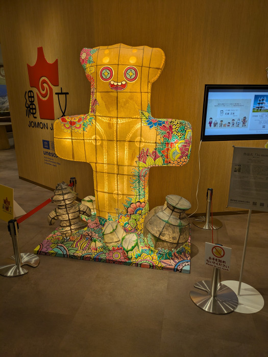 入ってすぐにねぶたが飾ってありました。結構大きくて140センチくらいはありそう。下は土偶と土器のねぶただと思うけど、真ん中はなんだろう?こういう土偶があるのかな?