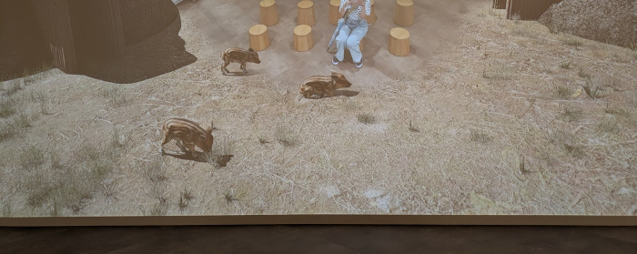 丸太みたいな椅子があって、そこに座ると目の前のスクリーンにイノシシが映って自分の足元へ来てくれます。可愛かったので、これが一番お気に入り笑