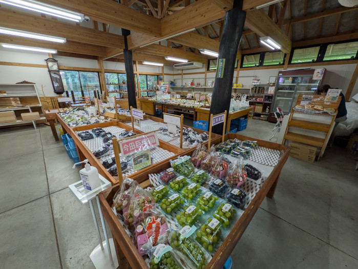 販売品:ブドウ、梨、野菜、産地名産品、木工、竹彫工、ワイン、菓子