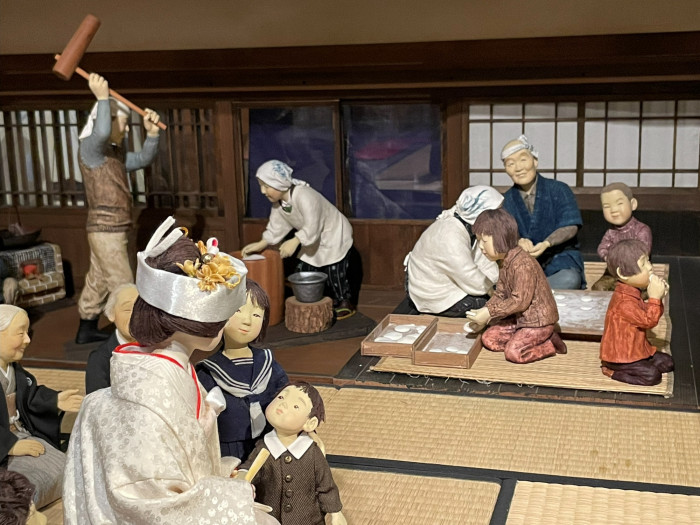 昭和の日常生活の一環として展示されていたお餅つきが、加納美術館では結婚式のお祝いのお餅つきとして表現されていました。