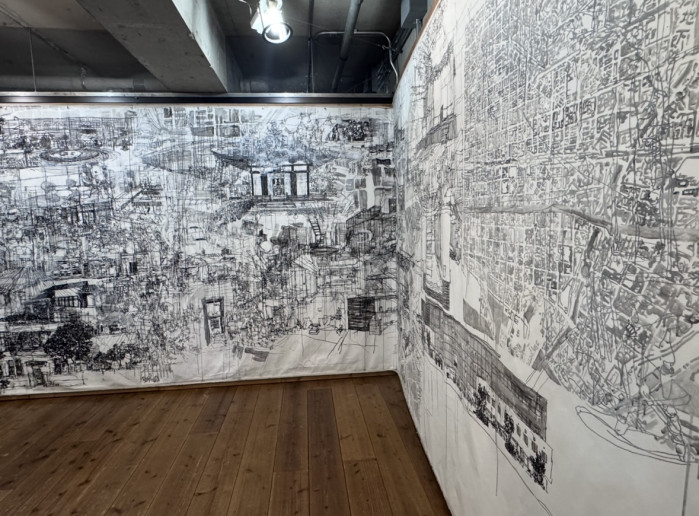 こちらは清原健彦さんの作品。巨大なキャンパスに神戸の街を描いています。作家さんが在廊していて詳しくお話を聴くことが出来ました。