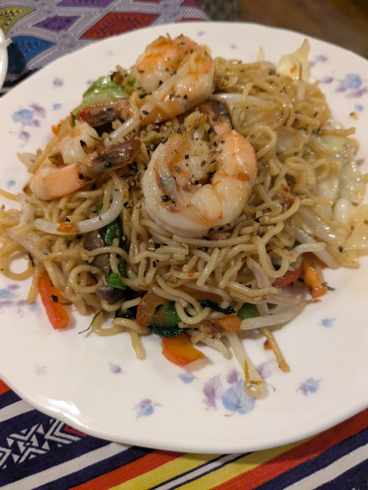 えびの焼きそばです。胡椒がたくさんかかっていてちょっとピリッとするところが癖になります。