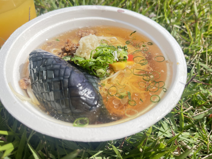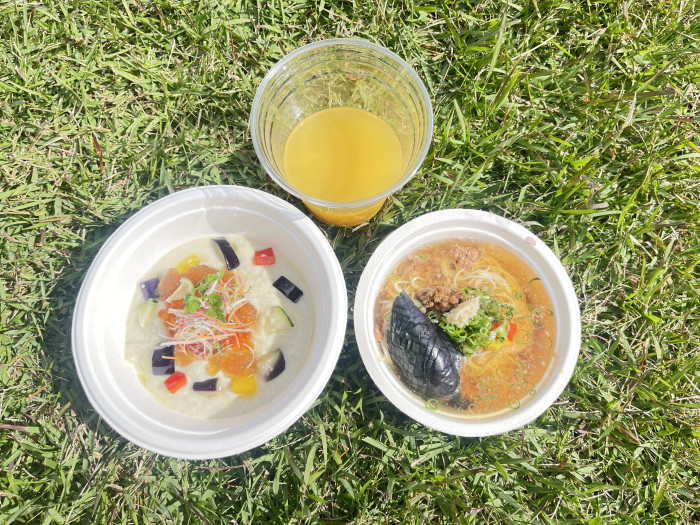 まずは「みなと風なすそうめん」。冷たい和風だしに、しっかり味のしみたなすがのった王道の味。トッピングはお好みでできたので、そぼろとねぎを生姜を入れました。つゆの香りがやさしく、トッピングを混ぜるたびに旨味が広がります。秋だけと少し暑い日だったので、冷たいなすそうめんはぴったりでした。