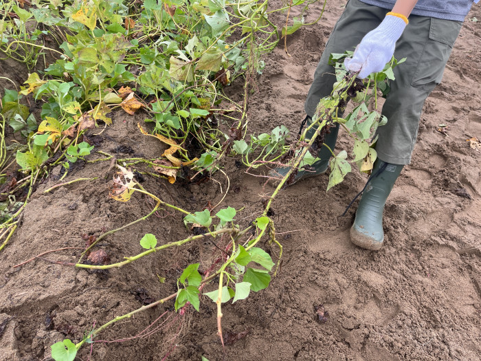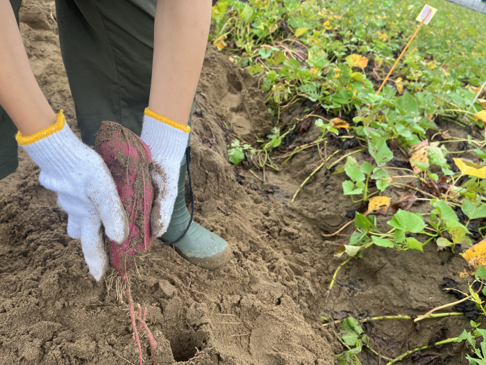 五郎島金時のいもほり体験に行ってきました!砂地のおかげで、芋掘りがたのしいです。ツルを引っ張り取り除き、サラサラの砂を手で軽くかき分けると、お芋がスルッと顔を出す―その感覚がとにかく楽しいんです!家族連れにも大人気。
