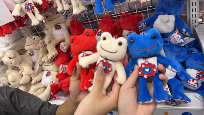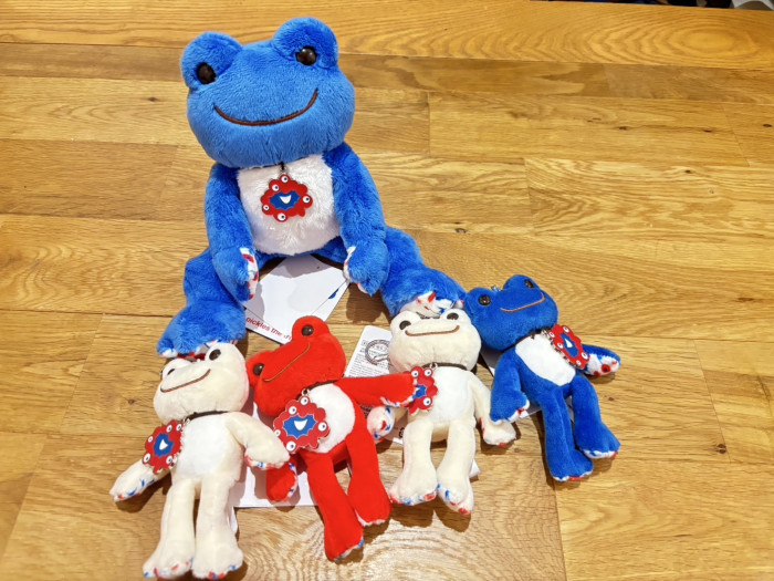 このカエルの人形ですが、子どもが生まれたとき、たまたまお店で見つけて買って以来、ピクルスのカエルを子ども3人小さいときに1匹ずつ好きで持っています。そのせいで、文房具やガチャガチャのグッズもたまに集めているんです。