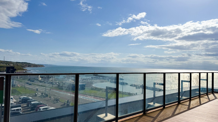 海沿いの国道231号線(通称:オロロンライン)に立つ、ガラス張りのモダンな建物。 全国的にも珍しい3階建ての道の駅です。