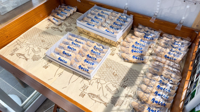 厚田港で穫れる特産のハタハタ(白あん)とシャコ(つぶあん)の形をした、ユニークな最中です。