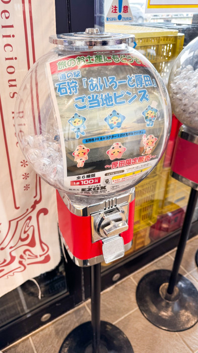 ご当地ピンズのガチャガチャです。 厚田限定のデザインもあるので見かけたらぜひ回してみてください。