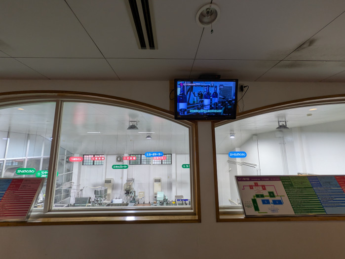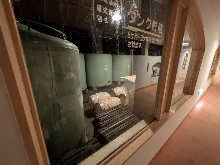 そして今回の一番のお目当ては、無料で見学できるワイン工場ツアー。ツアーと言ってもこの日は自由見学。館内外には99基ものタンクが並び、ぶどうの仕込みから発酵、熟成、瓶詰までの全工程を見ることができます。ステンレスタンクがずらりと並ぶ光景は圧巻で、まるでワインの香りに包まれた別世界。見学ルートには解説パネルやモニターが設置されており、初心者でも製造の流れがわかりやすく、学びながら楽しめる工夫がいっぱいです。