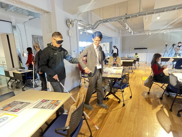 参加者は受付をすますと、アイマスクを着用して段差や階段を移動する体験に挑戦。視覚情報がない状態での不安や、周囲からの声かけの重要性を体感しました。「座るときがここまで怖いとは思わなかった」といった声が聞かれ、日常の中でも視覚が大きな役割を果たしていることを実感します。