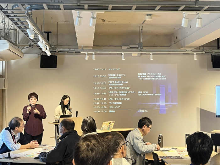 続くトークセッションでは、辻嵐飛鳥氏(アスカネット代表)と林由美子氏(鍼灸師/あうわ代表)が登壇し、働く上での情報取得の困難や、環境によって変わる安心感について話してくださいました。視覚障害のある人が日々行っている工夫や、地域の支えのあり方について共有できる機会です。