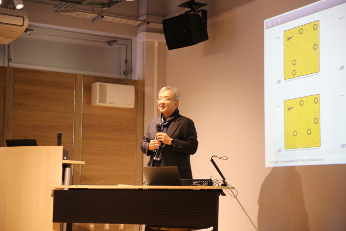講演は、金沢工業大学・松井くにお教授によるコード化点字ブロックの研究の紹介が行われました。コード化点字ブロックとは、点字ブロックの25個の点に色を割り当て、スマートフォンのカメラで読み取ると、位置情報や案内情報を取得できる技術です。