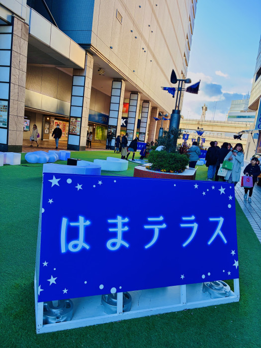 横浜駅東口にある「はまテラス」。青い看板と人工芝のコントラストが、歩き出す足を軽くしてくれます。