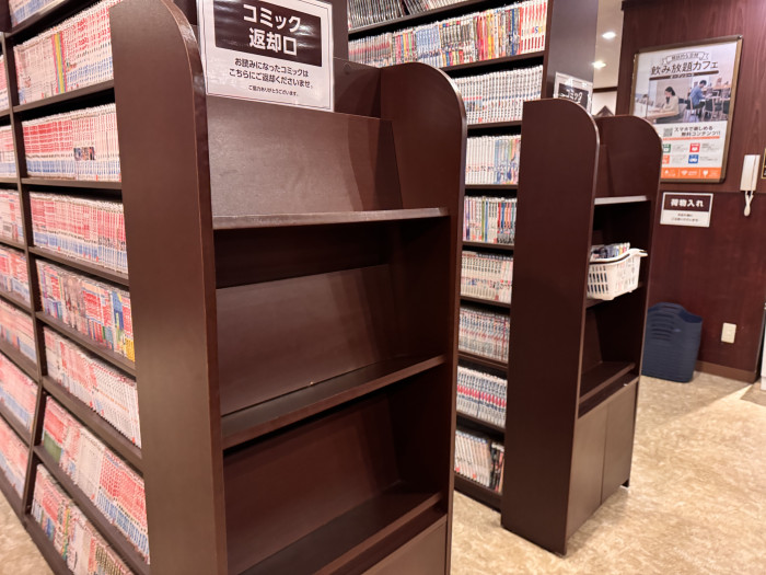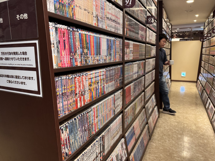 この膨大なコミックの中から好きなものを選んで(上の棚に手が届かない場合のために脚立があります)読みふけるもよし。