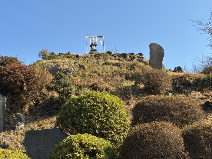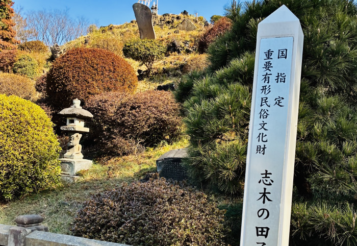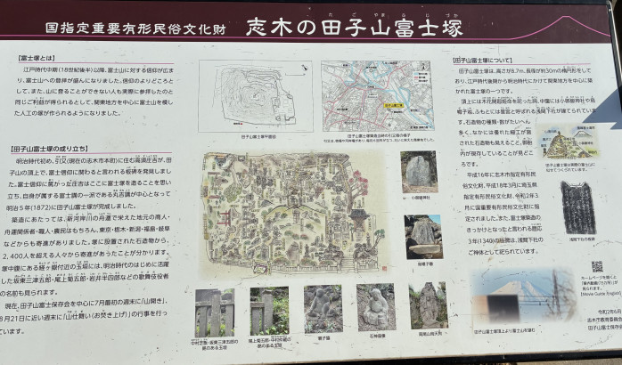 国指定重要有形民俗文化財の「田子山富士塚」です。明治5年に築かれたこの塚は、当時の人々の富士山への熱い信仰を今に伝えています。