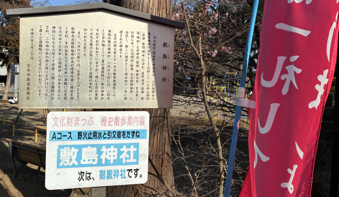 神社の歴史が記された案内板。江戸時代から続くこの地の信仰や、夏に行われる勇壮な『火祭り』について詳しく知ることができます。