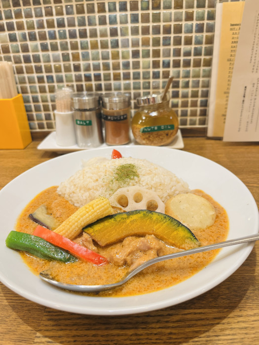 卓上の香辛料やナッツオイルで味変をしながら食べるとまったく飽きることなく、スパイスの香りとこっくりとした味わいを堪能できました。
