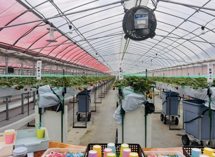 1900㎡の大きなハウスに約1万株、8品種のいちごを35分間食べ放題で楽しめます。小学生以上:2,500円。