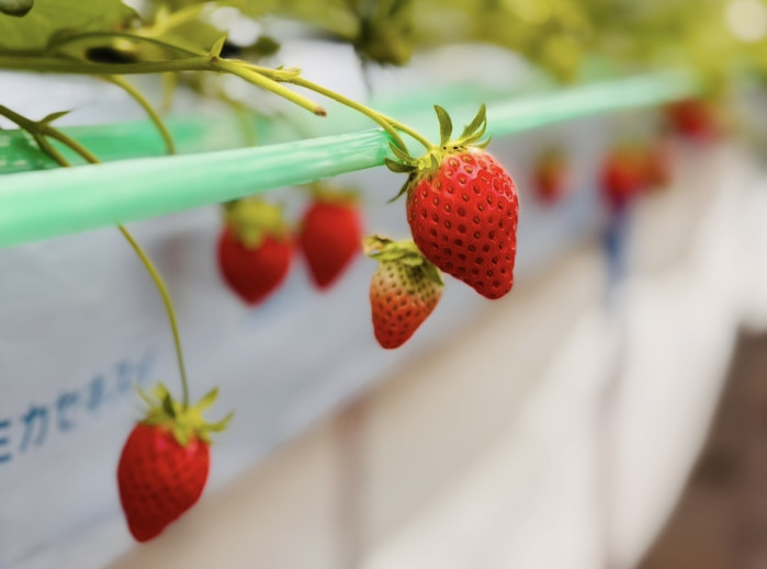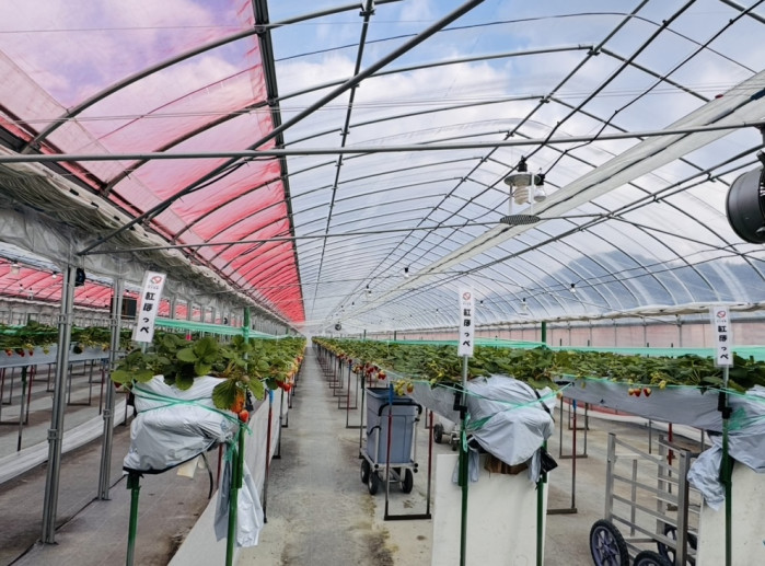 先の方が見えないくらいの奥まで続く“いちごの道”は圧巻です。