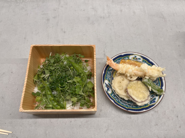 主力メニューは「おかもちセット」(税込4,200円〜)。約60種類の具材から5種類を選び、自分で細巻き寿司や軍艦巻きを仕上げる楽しさに加え、天ぷらや天丼、さらに抹茶を点てる工程までがひとつの体験として組み込まれています。