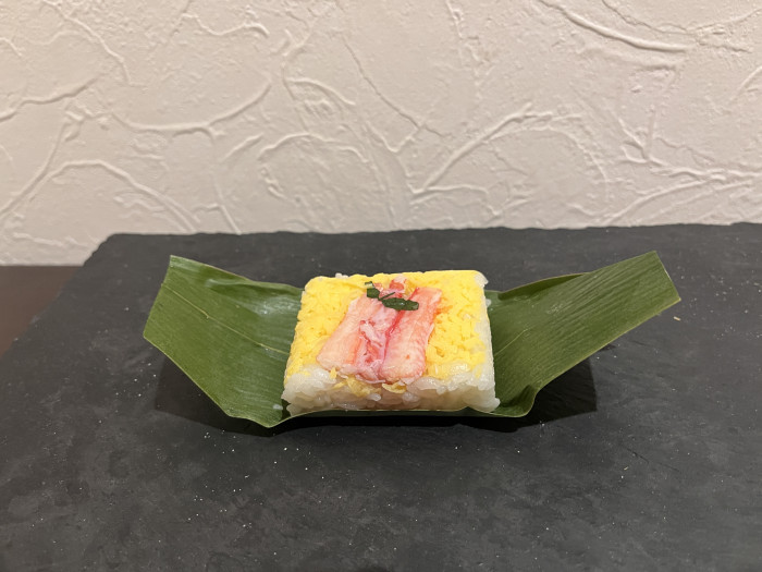 まずは【紅ずわいがに】。カニを載せた笹寿司。錦糸卵との相性がよく、ほどよいカニの甘さと卵の甘さが融合します。ししゃも卵と数の子を混ぜ込んだマヨネーズがコクをだしています。