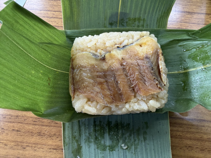 こちらは甘エビを使用した季節限定の味。船内凍結されたエビはぷりぷりです。昆布と笹にくるまれて、より深い味わいに。刻み柚子が冬の味のアクセントです。