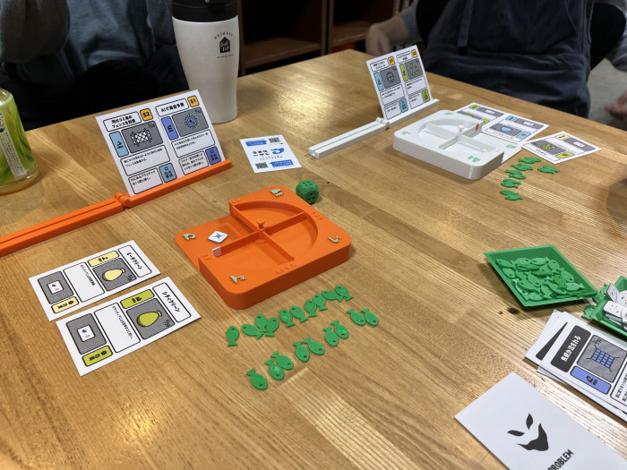 テーブルにはカラフルなボードやカード、小さな魚のコマ。プレイヤーはサイコロを振り、街や海のエリアで起こる出来事に対応していきます。「ポイ捨てが増える」「清掃活動を実施する」など、カードの内容によって状況は刻々と変化。ゲームを進めるうちに、ごみがどのように海へ流れ込み、生態系に影響を与えるのかが自然と理解できる仕組みになっています。