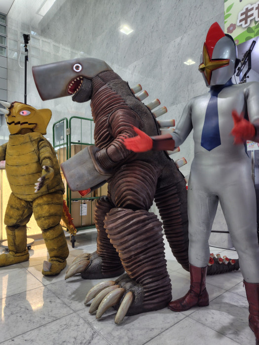 これはRKBラジオが放送している「空想労働サラリーマン」に登場する「会獣」で、頭がハンコの形をしているのが古代会獣ハンゴン。角の生えている怪獣が二面会獣オベッカーです。
