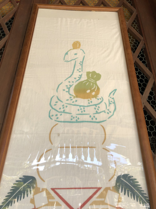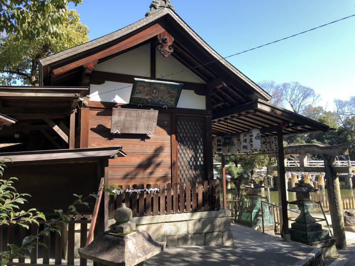 厳島神社があるのは、京都御苑内の九条邸跡。九条池の中島にお社が建っていることから、「池の弁天さん」とも呼ばれているそうで、本殿には弁財天の使いである白蛇が描かれていました。