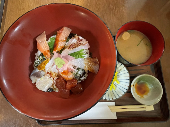 ご飯を少なくしてもらった海鮮丼。魚の種類が多いです!ご飯が少ないために物足りなく見えますが、結構お腹いっぱいになります。