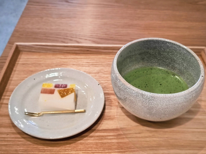 ほんのりあったかいお抹茶とさっぱりとした甘さとフルーツが絶妙な美味しさの羊羹がとってもおいしいかった!