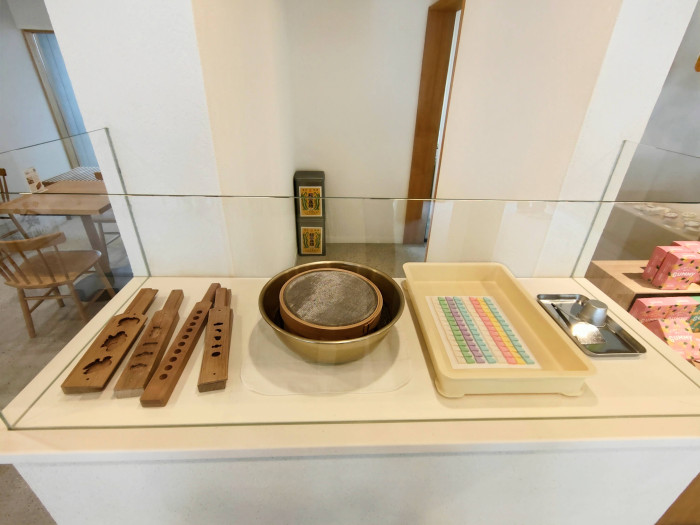 ショーケースには看板商品の「Drawing」(一番右にあるカラフルな落雁です)をはじめ多彩な種類の落雁や金平糖などが並んでいました。