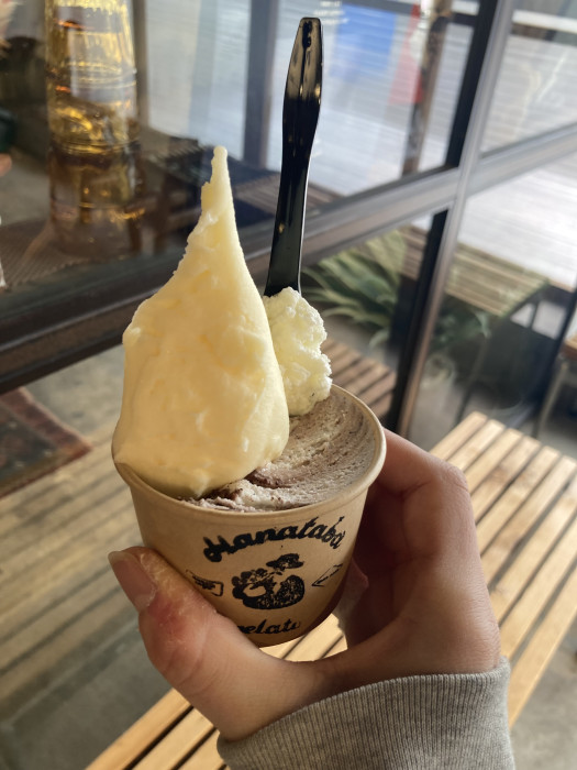 私はカップのダブルの八朔ソルベと禁断のティラミスにしました。ダブルを頼んだのですが、おまけの一口というのをしているみたいなのでミルクをスプーン一杯分いただきました。味はいろいろな種類があって日によって変わるそうです。