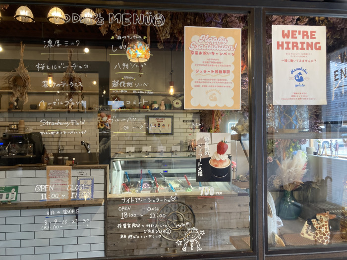 店内はドライフラワーの装飾がされていて、すごくおしゃれで可愛かったです。期間限定の越後姫のジェラート大福というのもあってとても美味しそうでした。冬季期間は後ろから入る形となっていますが暖かくなると正面のプラスチックのところが開くので正面から入れるようになります!!