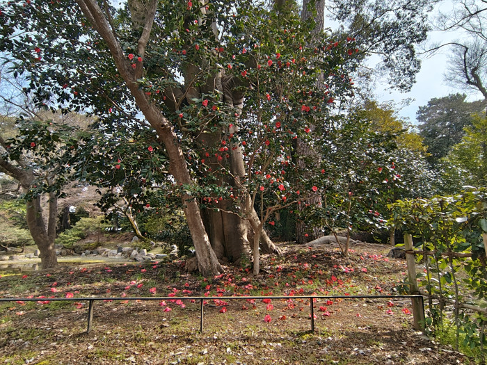 近衛邸跡で桜が華やかの姿を見せてくれる中、その横で静かに咲いている椿。