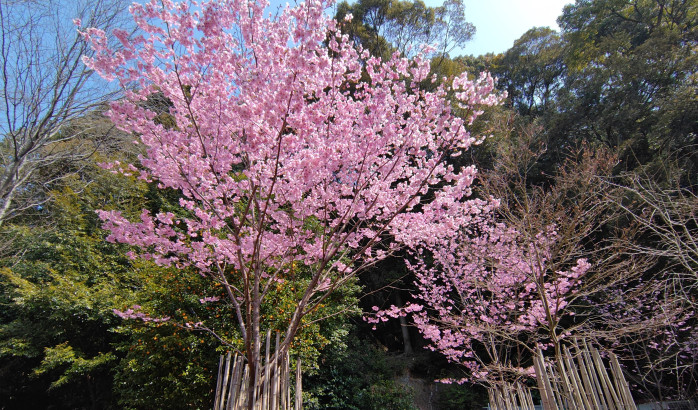 一般的な桜よりも濃いピンク色で上に上に伸びる枝ぶりがポジティブ!