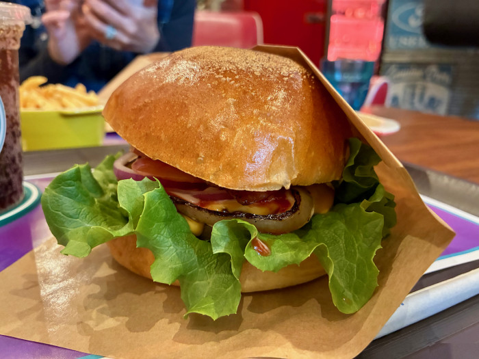 カフェとしての利用もできますが、主役はあくまで食べごたえのあるハンバーガー。店内にはアメリカ雑貨が並び、ポップでどこか非日常感のある空間が広がっています。