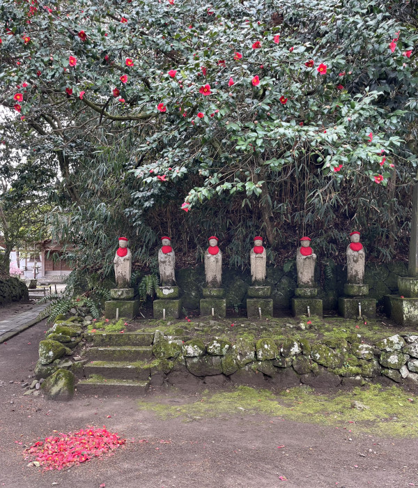 椿とお地蔵様、椿も満開です。真紅の花がとても綺麗でした。