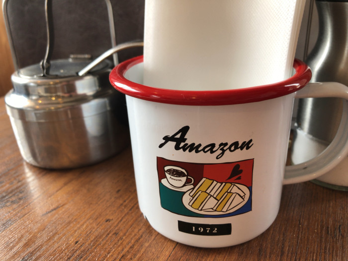 2階へ案内されて席に着くと、テーブルに置かれた、ホーローの可愛いマグカップが目に入りました。1階のレジ近くで販売もされている、喫茶アマゾンオリジナルのマグカップです。