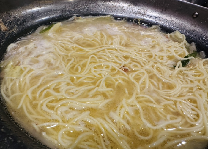 細麺がにんにくの利いたスープに絡んでめちゃくちゃ濃厚でおいしい。