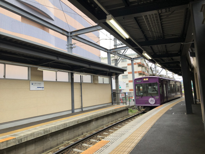 仁和寺の桜を観に、嵐電で御室仁和寺駅まで行きました。始発駅の北野白梅町駅から嵐電に乗って出発です。