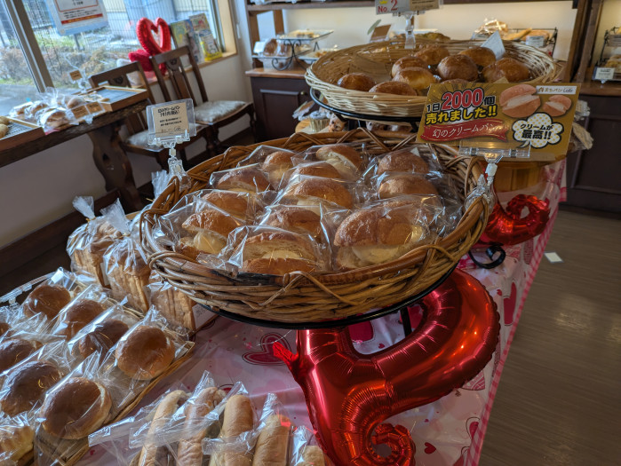 店先には、おすすめとして「幻のクリームパン」の案内があり、1日に2000個売れたこともあるのだとか。気になりながら店内に入ると、たくさんの種類のパンが並んでいて、どれにしようか迷ってしまいました。ソーセージを使ったお総菜パンのように食事に合いそうなものから、あんパンなどの甘いパンまでそろっていて、見ている時間も楽しかったです。
