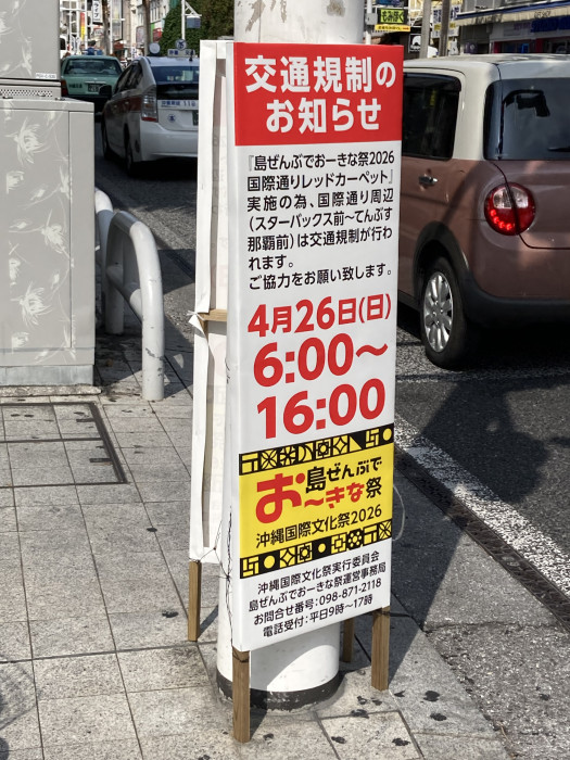 来たる4/26(日)、毎年恒例の「島ぜんぶでおーきな祭」が開催されます。これに伴い、国際通りでは交通規制が行われます。みなさん、ご注意くださいね。